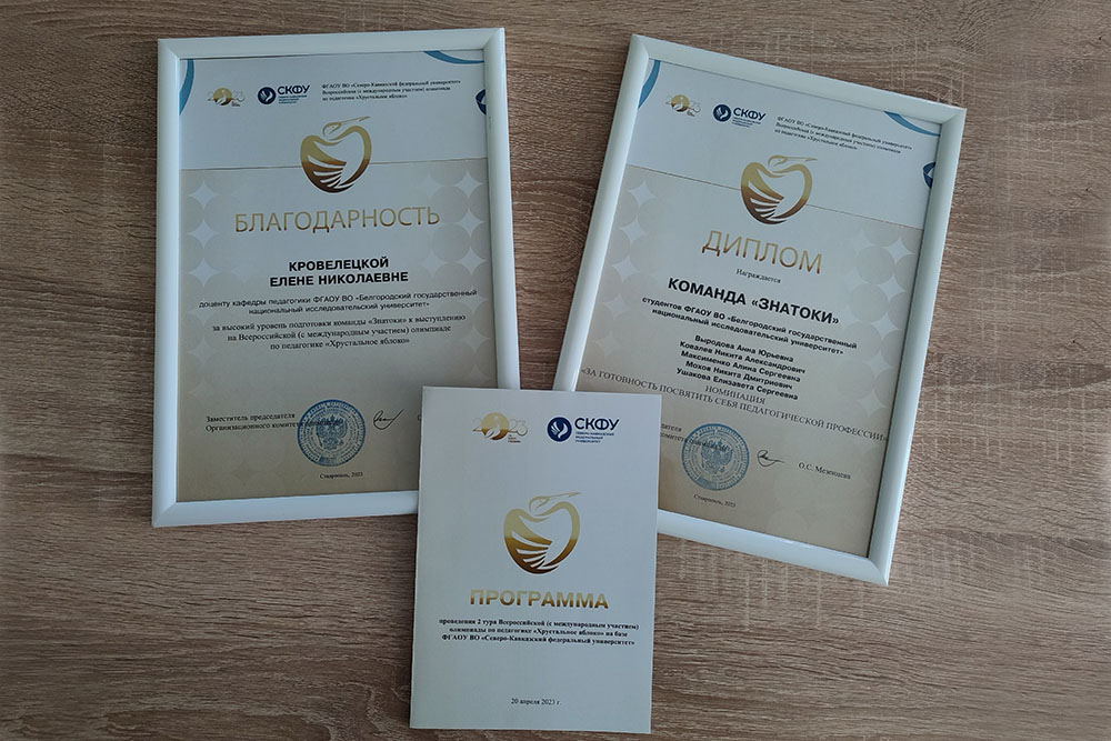 По итогам олимпиады команда Белгородского госуниверситета «Знатоки» одержала победу в номинации «За готовность посвятить себя педагогической профессии». Подготовкой команды руководили преподаватели кафедры педагогики: профессор Наталия Шеховская, доценты Елена Кролевецкая и Дарья Михайлова.