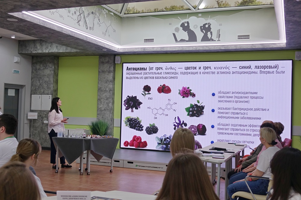 Спикер рассказала об антоцианах, показала, как выглядит жидкий и порошковый краситель из антоцианов, продемонстрировала короткий фильм о создании полезной декоративной и уходовой косметики.