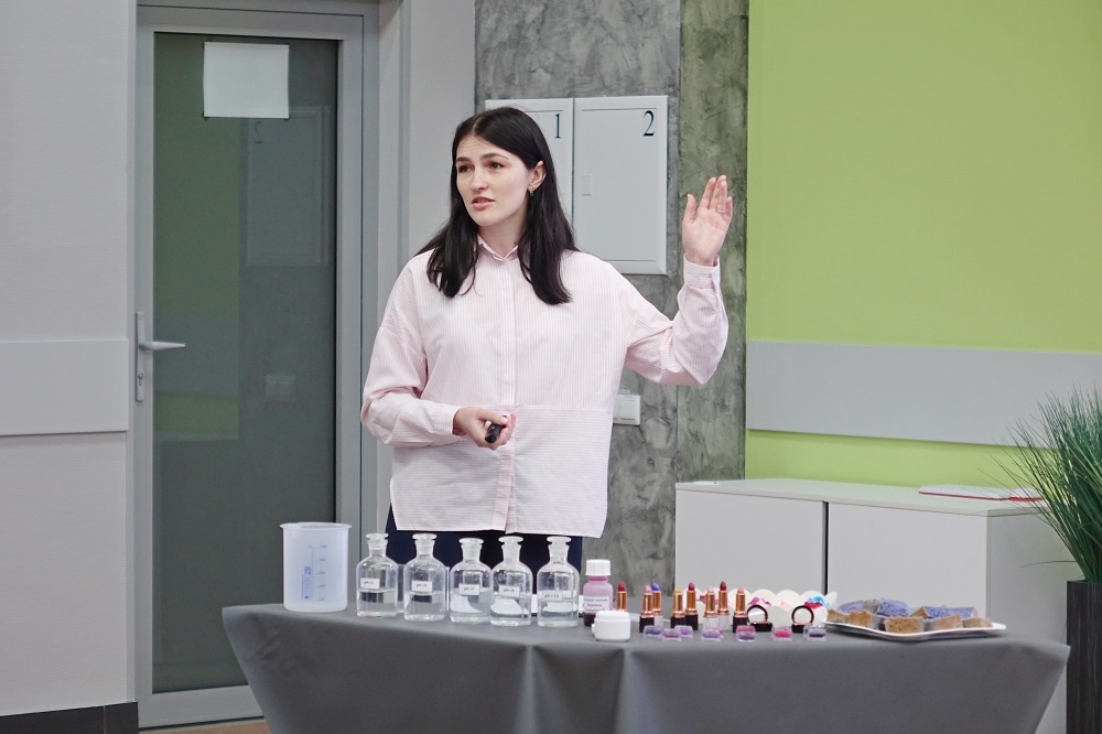 О современных биологически активных добавках в косметике и продуктах питания участникам школы рассказала старший преподаватель кафедры общей химии Ярослава Саласина. Тема её доклада – «Биологически активные добавки: от идеи до натуральной косметики».