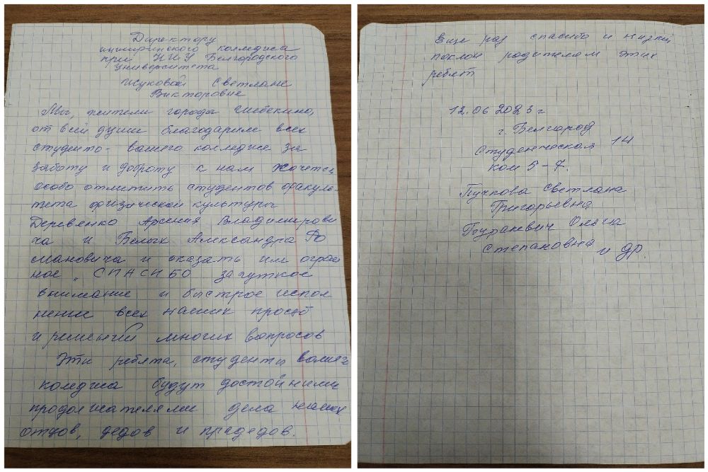 В адрес администрации инжинирингового колледжа НИУ «БелГУ» эвакуированные жители Шебекинского городского округа направили благодарность волонтёрам за проявленную заботу, за внимание и помощь.