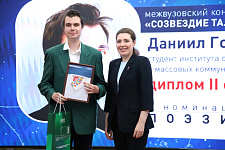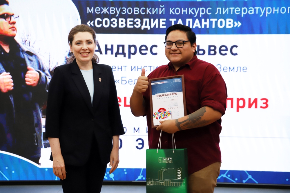 Евгения Анатольевна вручила заслуженные награды конкурсантам. В номинации «Поэзия» первое место заняла студентка колледжа высоких технологий БГТУ имени В.Г. Шухова Дарья Мальо-Субботина, второе место у студента института общественных наук и массовых коммуникаций НИУ «БелГУ» Даниила Говорова, третьего места, по оценкам жюри, удостоена ординатор медицинского института НИУ «БелГУ» Эльвира Миненкова. Специальный приз за авторское стихотворение на иностранном языке и.о. ректора Евгения Карловская вручила студенту института наук о Земле НИУ «БелГУ» из Эквадора Андресу Гальвесу.