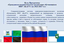 – Целью программы является совершенствование системы гражданско-патриотического воспитания обучающихся, направленной на формирование и развитие у студенческой молодёжи патриотического сознания, гражданской ответственности, уважения к Родине на основе единых патриотических ценностей, чувства любви к ней и гордости за собственную страну, её историю, культуру и достижения в экономике, науке и спорте, готовности к служению Отечеству и созидательной защите интересов Российской Федерации, – пояснила Елена Юрьевна.