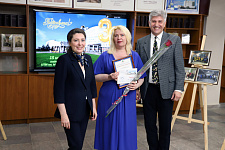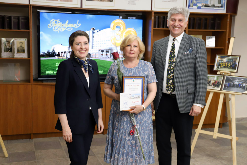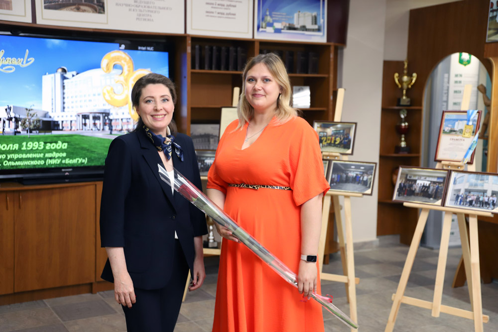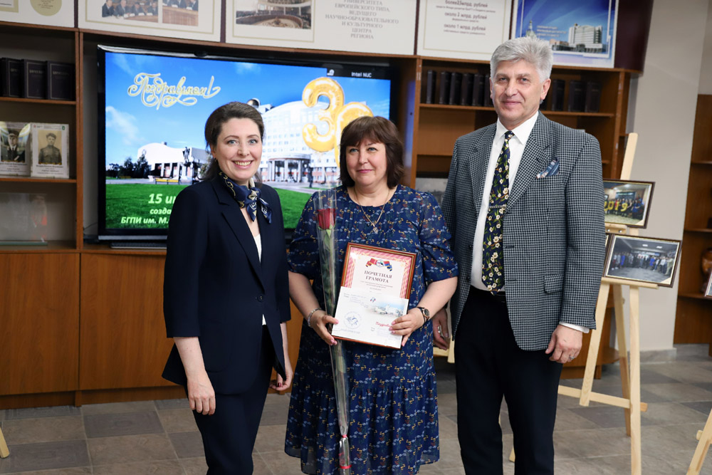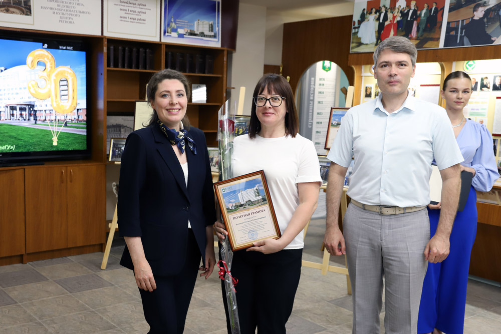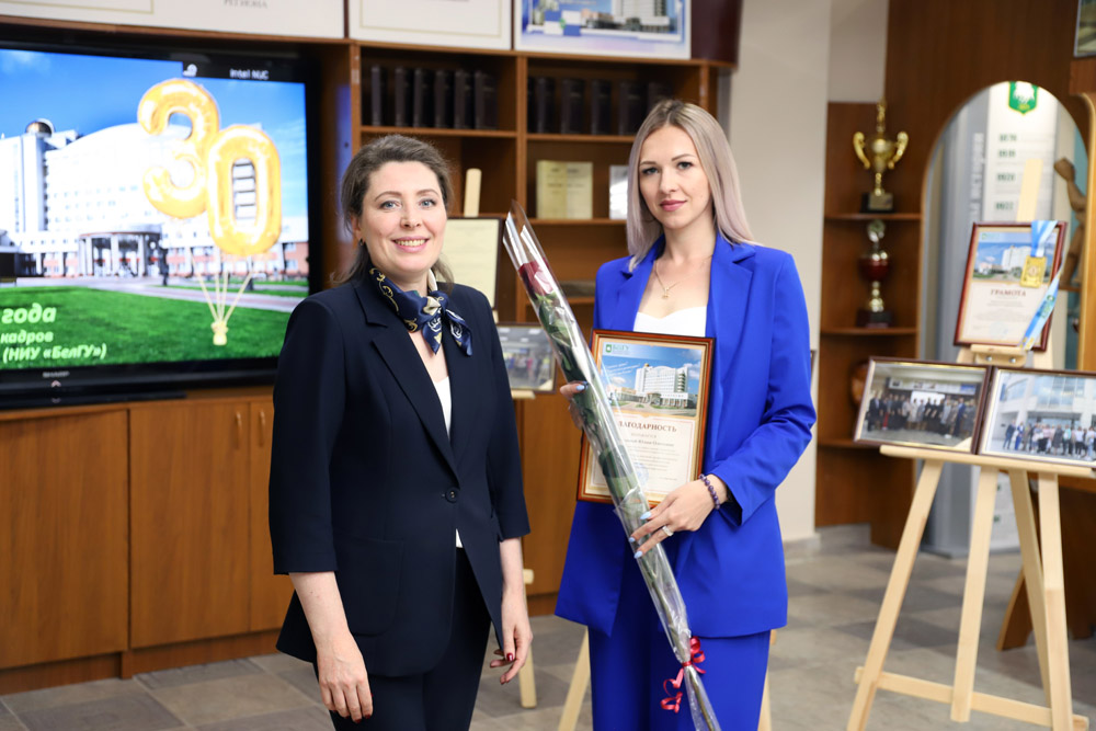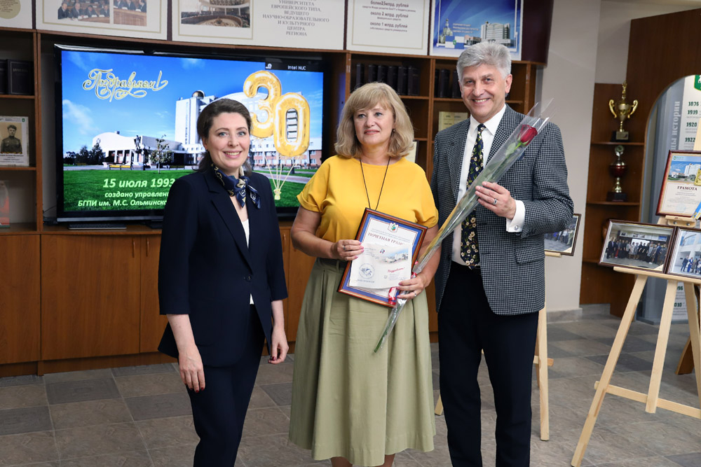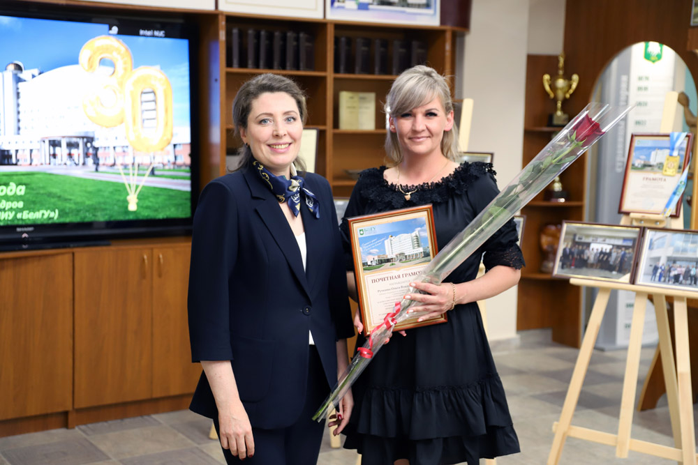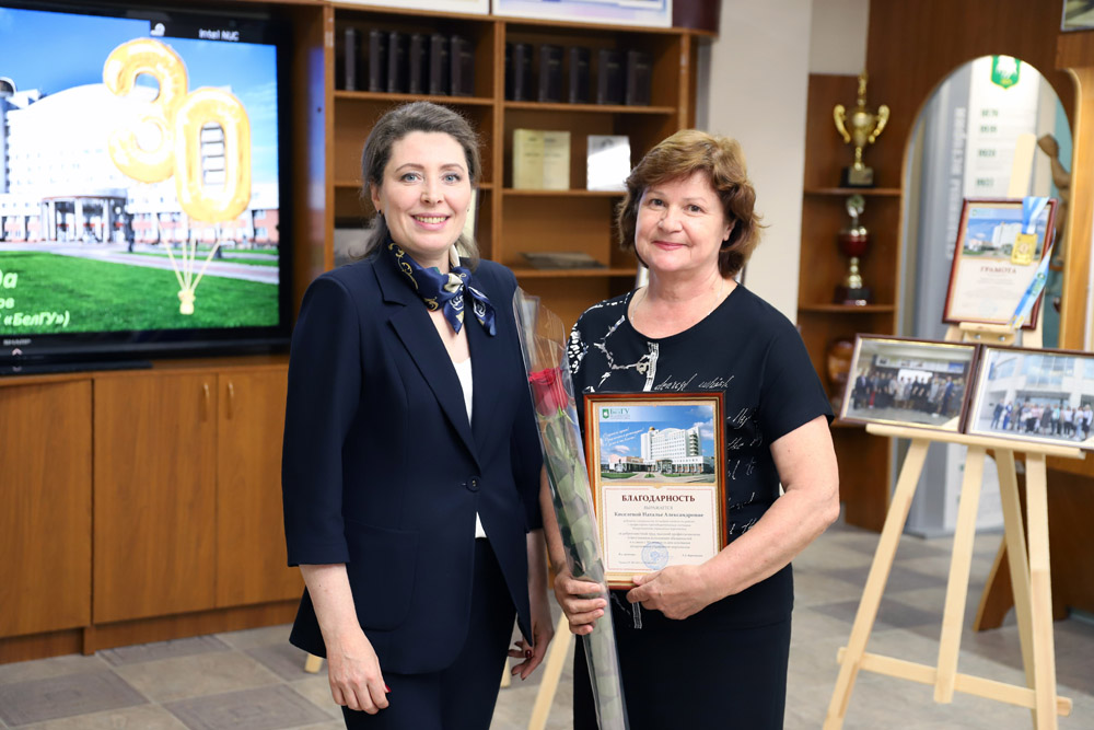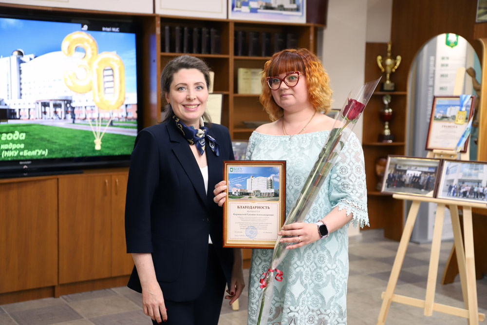 Евгения Карловская вручила Благодарственное письмо министерства образования Белгородской области директору департамента Николаю Реутову и Почётные грамоты вуза сотрудникам департамента.