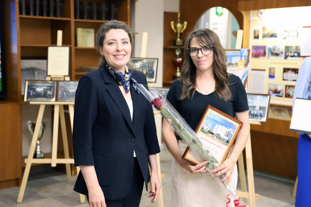 На торжественной церемонии исполняющая обязанности ректора Евгения Карловская вручила награды сотрудникам департамента управления персоналом.