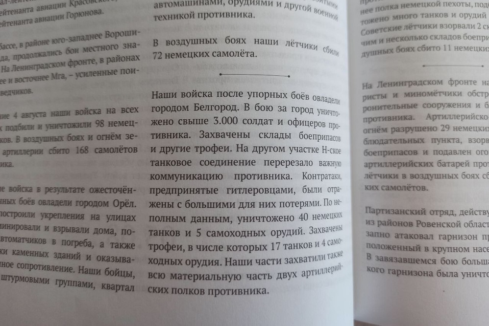 Так, в сводках за 5 августа 1943 года говорится: «Наши войска после упорных боёв овладели городом Белгород. В бою за город уничтожено свыше 3.000 солдат и офицеров противника. Захвачены склады боеприпасов и другие трофеи. На другом участке Н-ское танковое соединение перерезало важную коммуникацию противника. Контратаки, предпринятые гитлеровцами, были отражены с большими для них потерями. По неполным данным, уничтожено 40 немецких танков и 5 самоходных орудий. Захвачены трофеи, в числе которых 17 танков и 4 самоходных орудия. Наши части захватили также всю материальную часть двух артиллерийских полков противника. В воздушных боях в течение дня сбито 66 немецких самолётов».
