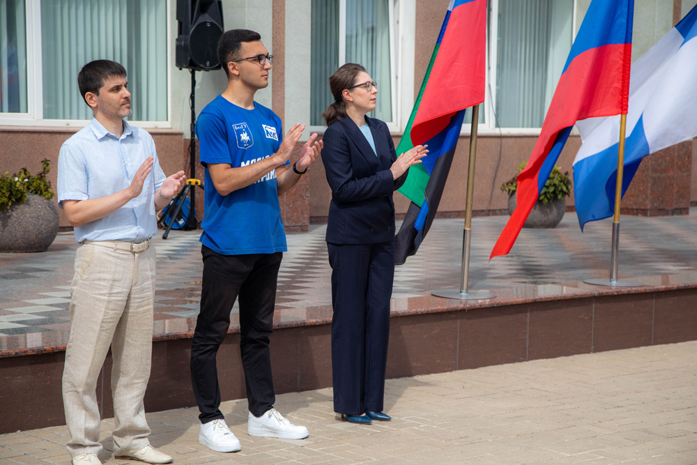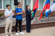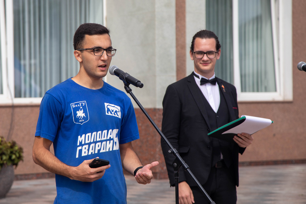 Для торжественного поднятия флага Российской Федерации к флагштоку пригласили студента первого курса медицинского института Михаила Бессмертного. Флаг Белгородской области доверили поднять студентке первого курса института экономики и управления Екатерине Приходько, а флаг Белгородского госуниверситета – студенту первого курса института инженерных и цифровых технологий Георгию Стурову.