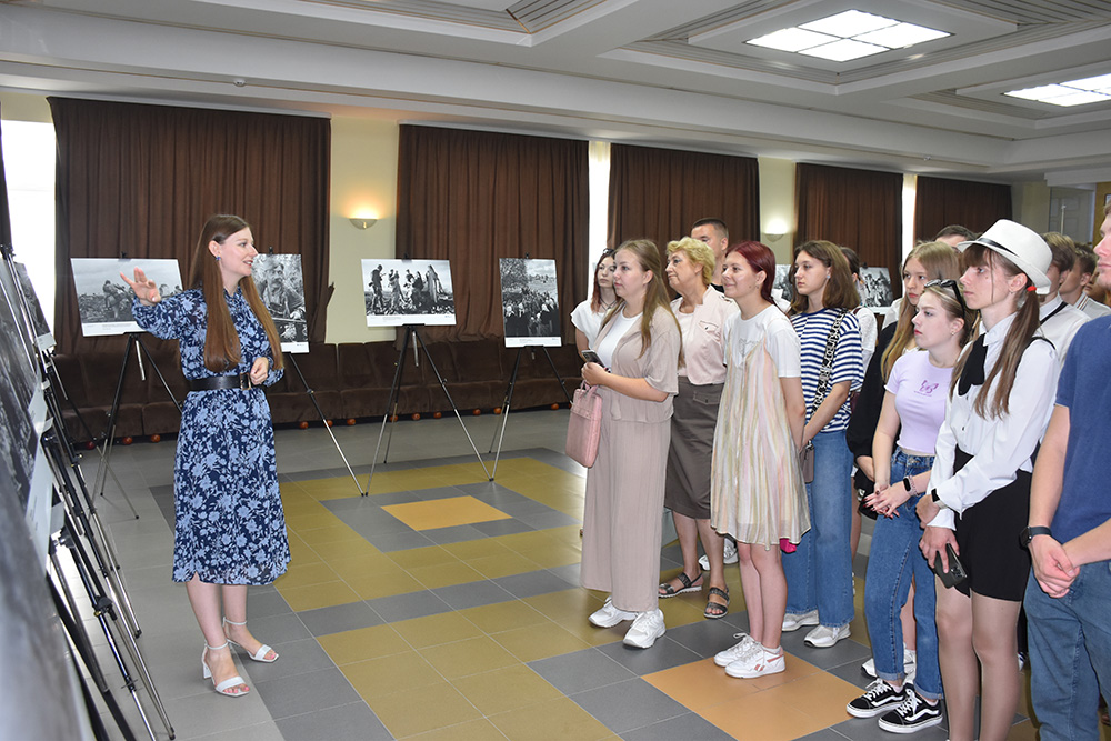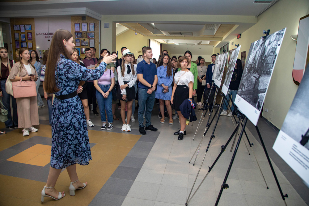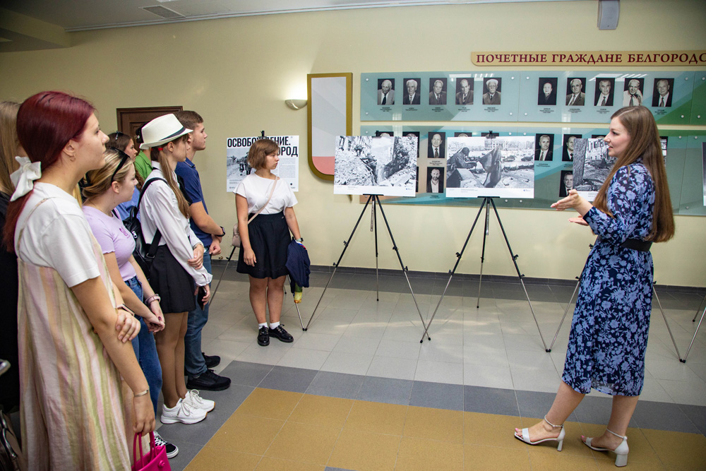 Экскурсию по выставке «Освобождение. 1943» для студентов первого курса из всех институтов и колледжей провели сотрудники музея истории НИУ «БелГУ». В экспозиции представлены 30 уникальных фотографий времён Великой Отечественной войны, сделанные военными корреспондентами Совинформбюро на полях сражений и освобождённых территориях.