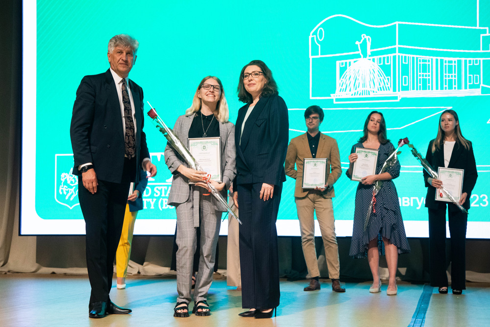 На конференции были вручены награды Первичной профсоюзной организации НИУ «БелГУ» и положено начало новой традиции – вручения выпускникам НИУ «БелГУ» сертификатов о трудоустройстве, гарантирующих молодым специалистам работу в коллективе университета. Ряды сотрудников вуза пополнили семь человек.