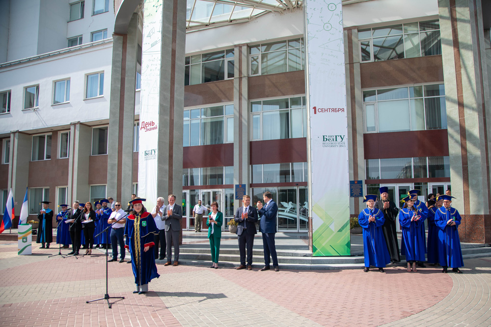 Продолжился День знаний традиционным академическим шествием. Под аккомпанемент ректорского духового оркестра представители руководства университета, члены учёного совета, преподаватели и студенты выпускных курсов прошли по улицам Белгорода. Участники процессии возложили венки к Вечному огню на Соборной площади. Завершилось шествие на университетской площади, где состоялась торжественная линейка.