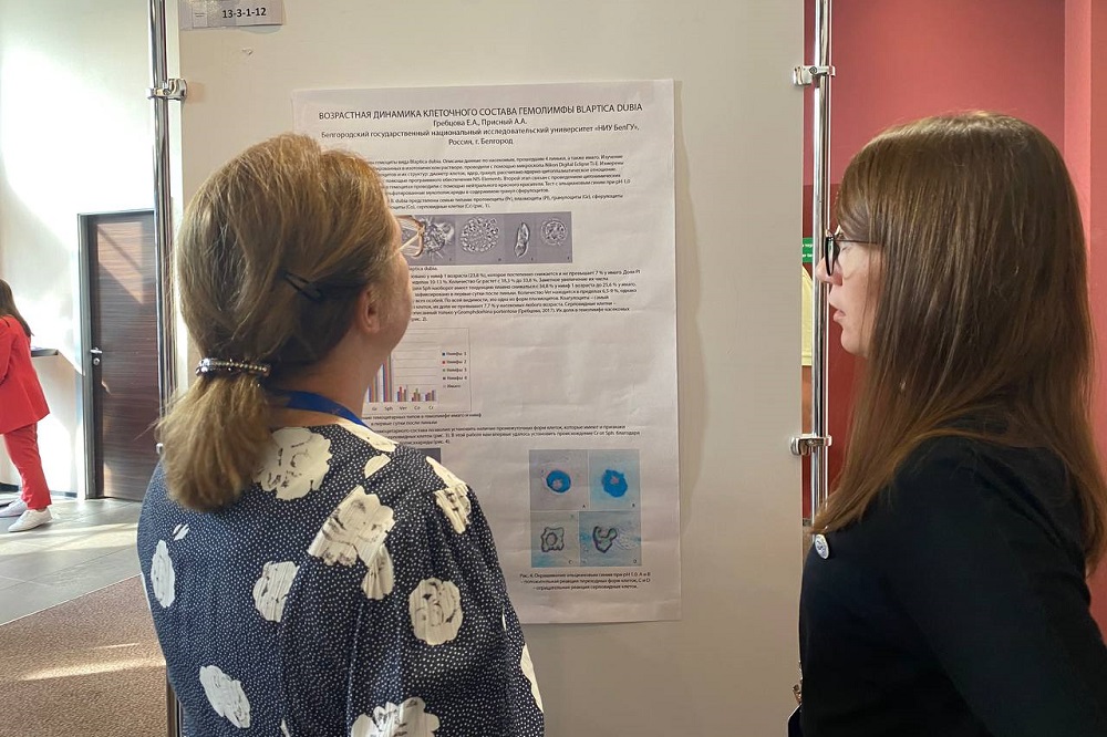 В стендовой сессии результаты своих научных исследований представили старший преподаватель кафедры биологии, кандидат биологических наук Елена Гребцова и аспирант кафедры биологии, руководитель Студенческого научного общества НИУ «БелГУ» Марина Потапова. Тематика работы Елены Александровны была посвящена возрастной динамике клеточного состава гемолимфы Blaptica dubia. Марина Потапова презентовала доклад на тему «Влияние Дитрима на показатели лейкоцитарной формулы у птиц». В роли слушателей в работе съезда приняли участие студенты ИФХиБ Евгения Сергеева и Елизавета Бушенкова.