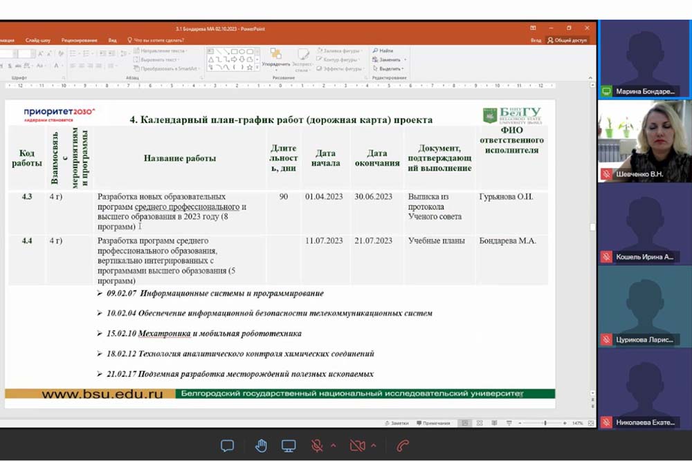 Одним из приоритетов НИУ «БелГУ» в рамках стратпроекта «Лидеры будущего» является развитие системы инженерного и естественнонаучного образования. Как отметила руководитель проекта – начальник учебно-методического управления департамента образовательной политики Марина Бондарева, к ноябрю 2024 года доля обучающихся по программам инженерного и естественно-научного направлений должна составить не менее 55% от общего числа студентов вуза, а число «целевиков» – увеличиться до 23,8%.