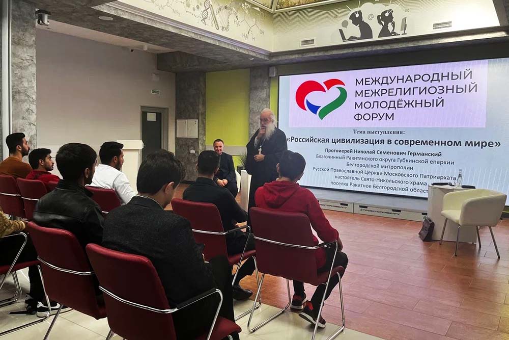 В проектно-образовательном пространстве «Проектория» НИУ «БелГУ» состоялась встреча-дискуссия с участием иностранных обучающихся на тему «Российская цивилизация в современном мире». Спикером дискуссионной площадки, прошедшей в формате открытого диалога, выступил благочинный Ракитянского округа Губкинской епархии Белгородской митрополии, настоятель Свято-Никольского храма посёлка Ракитное протоиерей Николай Германский.