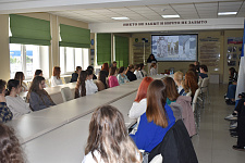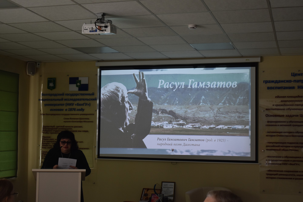 Ведущая мероприятия, специалист по библиотечно-выставочной работе Научной библиотеки имени Н.Н. Страхова Ольга Анохина рассказала студентам об истории и традициях памятного праздника, инициатором которого стал народный поэт Дагестана Расул Гамзатов.