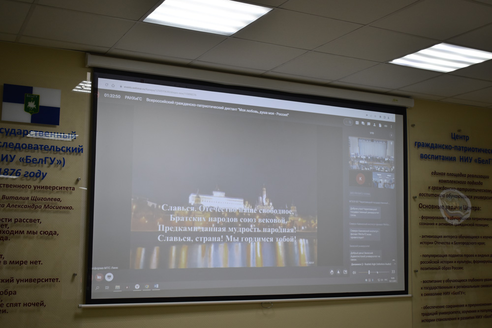 Во Всероссийском гражданско-патриотическом диктанте «Моя любовь, душа моя – Россия!» приняло участие более 200 студентов Белгородского госуниверситета, представляющих все институты вуза и инжиниринговый колледж. Мероприятие проходило на базе института общественных наук и массовых коммуникаций и Центра гражданско-патриотического воспитания.