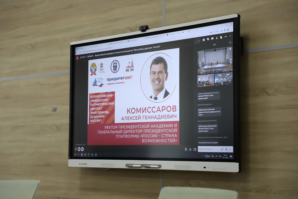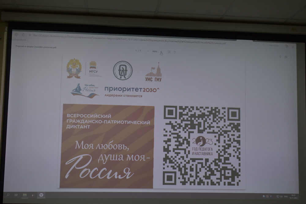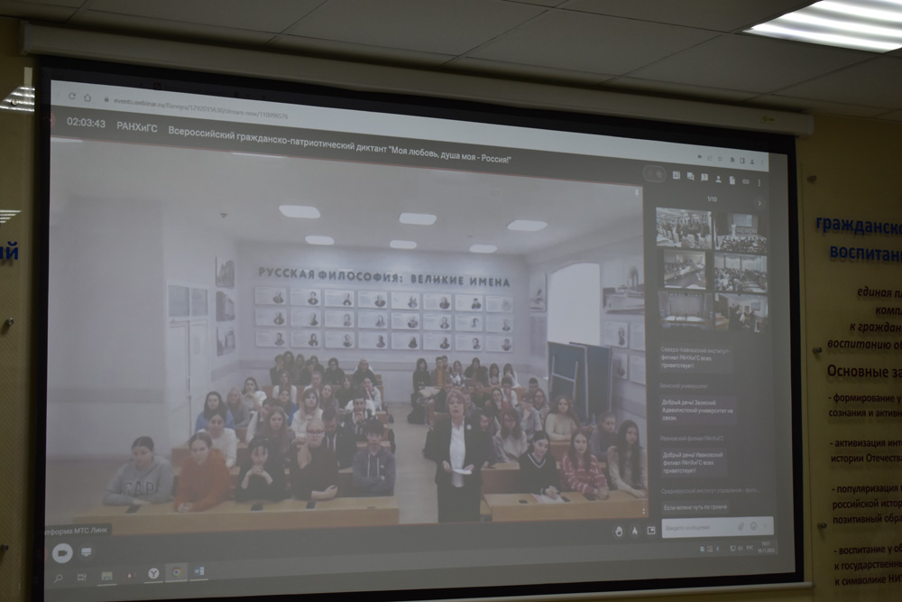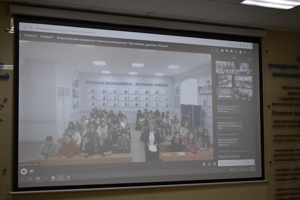 От НИУ «БелГУ» студентов, присоединившихся к написанию диктанта, приветствовала заведующая кафедрой философии и теологии Тамара Липич, которая отметила, что в современных условиях общество должно опираться на традиционные ценности, проявлять уважение к национальным и конфессиональным особенностям народов, проживающих на территории Российской Федерации.