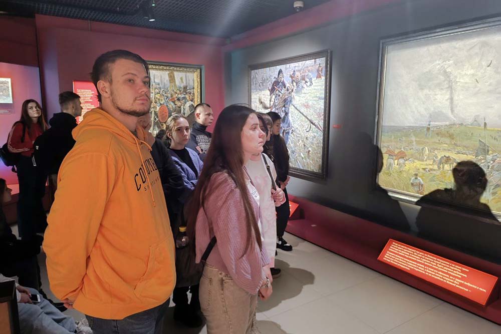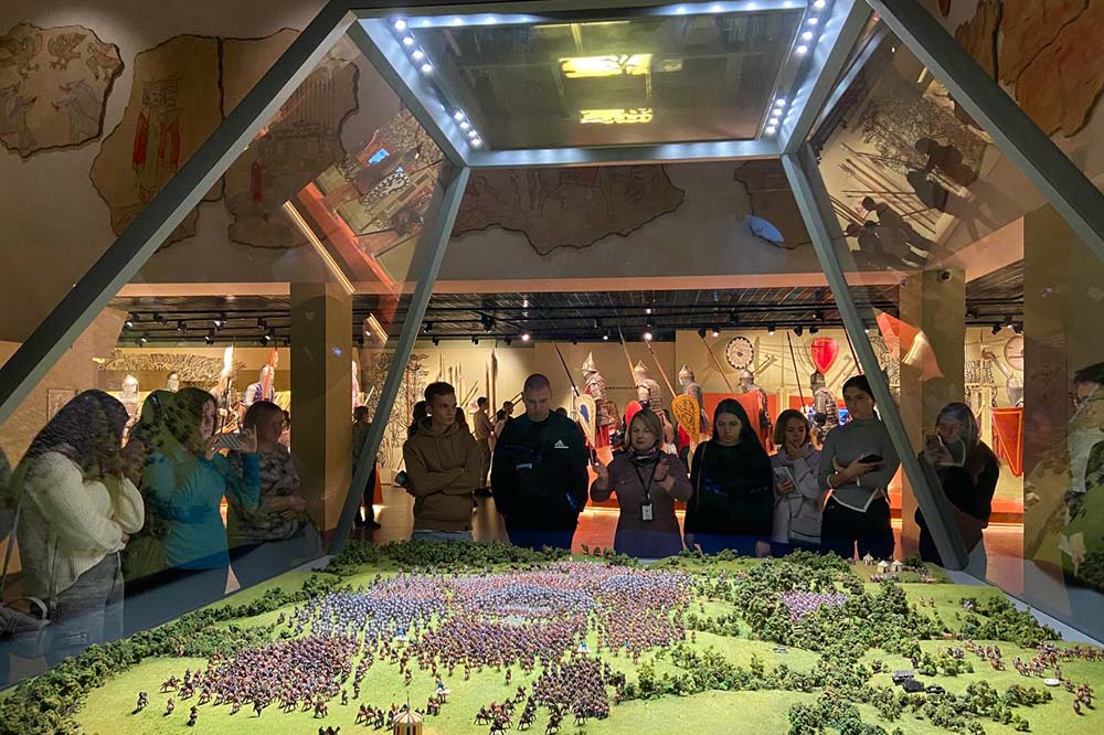 – Интерактивный макет Куликовской битвы воссоздаёт исторический ландшафт того времени и показывает, какими были силы противников, как наносились удары и в чём военная хитрость князя Дмитрия Донского. Мы увидели разницу в вооружении ордынцев и русских воинов, подержали в своих руках макеты оружия, попробовали поднять амуницию одного из воинов, – поделилась впечатлениями студентка факультета дошкольного, начального и специального образования педагогического института Дарья Истомина.