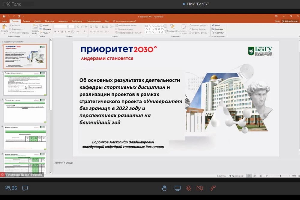 Заведующий кафедрой спортивных дисциплин Александр Воронков представил доклад об основных результатах деятельности кафедры и реализации проектов в рамках стратпроекта «Университета без границ», один из которых под названием «Ты не один!» нацелен на развитие региональной системы адаптивной физической культуры на базе НИУ «БелГУ».