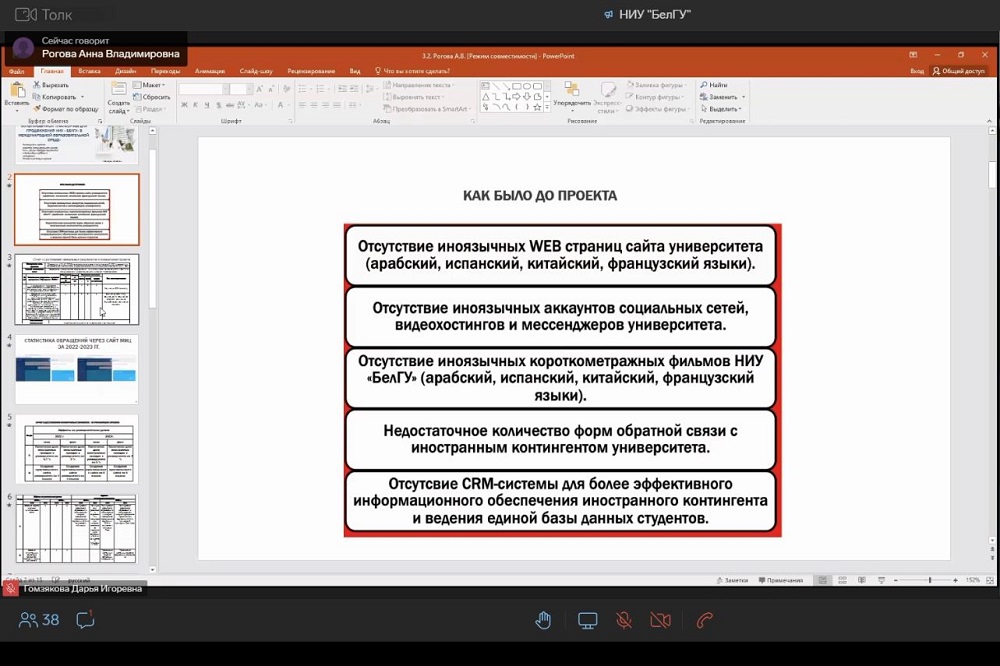 Также на заседании приняли решение о закрытии двух проектов, срок реализации которых подошёл к концу. Речь идёт о создании мультиязычного пространства для продвижения НИУ «БелГУ» в международной образовательной среде под руководством директора международного центра Анны Роговой и о проекте «Создание международного центра симуляционного обучения и научных исследований в области нейромаркетинговых технологий» под руководством доктора экономических наук Бориса Тхорикова.