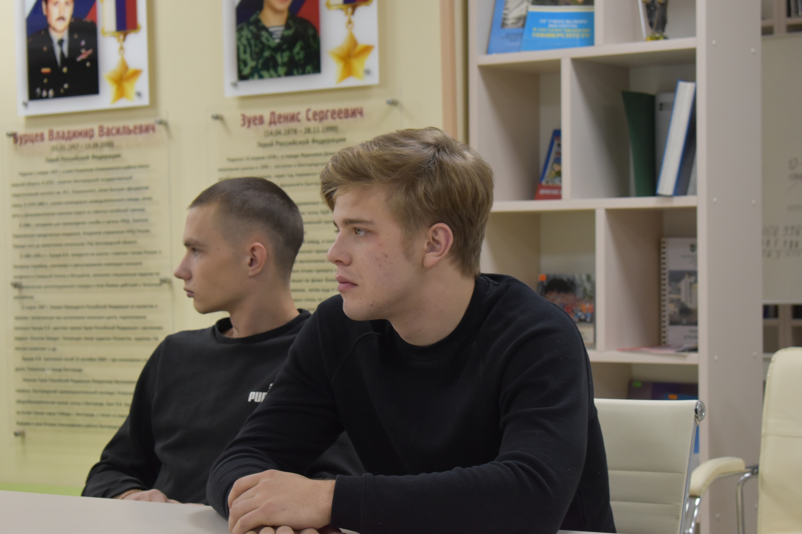 Более подробно ведущие рассказали о Героях России Владимире Васильевиче Бурцеве и Денисе Сергеевиче Зуеве, судьбы которых были связаны с Белгородским государственным университетом. В Центре гражданско-патриотического воспитания Героям России посвящены отдельные стенды. О их судьбе и боевых действиях студенты узнали из специального репортажа Сергея Рудешко «Памяти Героя России Владимира Бурцева» и выпуска программы «Героические улицы Белгорода» о Денисе Зуеве.