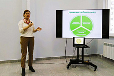 Заведующая кафедрой Ксения Королева рассказала о специфике социальной работы как сферы профессиональной деятельности, а студенты, обучающиеся по данному направлению подготовки, поделились опытом участия в различных мероприятиях в качестве добровольцев.