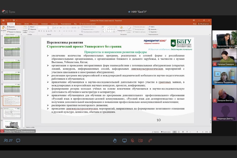 С докладом об основных результатах деятельности кафедры русского языка, профессионально-речевой и межкультурной коммуникации и реализуемых проектах в рамках стратпроекта «Университет без границ» в 2023 году выступила заведующая кафедрой Людмила Свойкина.