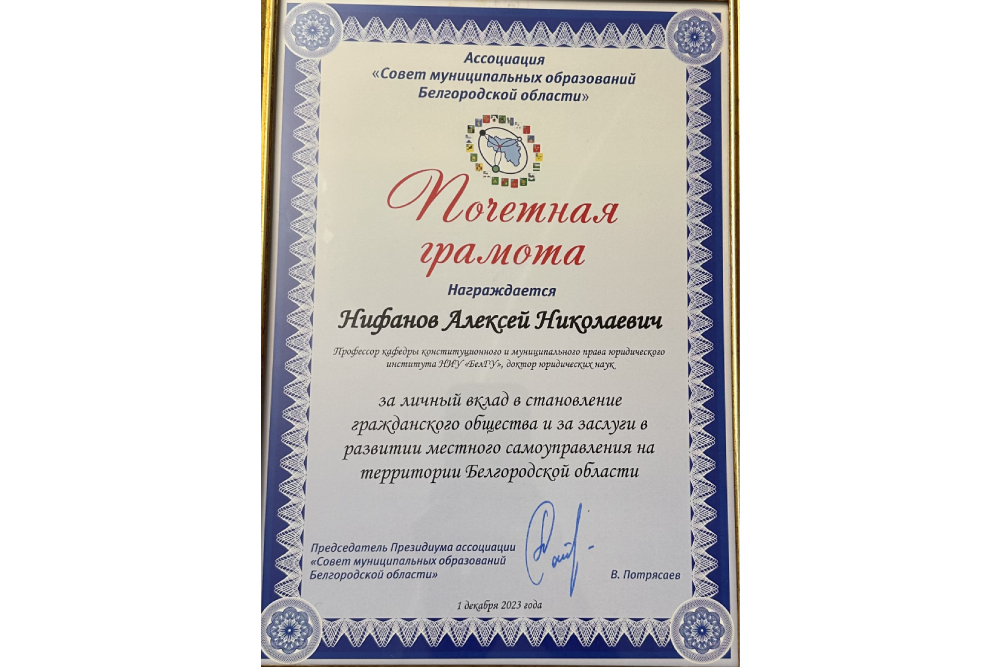 Профессор кафедры конституционного и международного права юридического института НИУ «БелГУ» Алексей Нифанов в своём докладе сосредоточил внимание на основных изменениях законодательства за период с момента принятия современной Конституции России. За личный вклад в становление гражданского общества и за заслуги в развитии местного самоуправления на территории Белгородской области Алексей Николаевич был награжден Почётной грамотой Ассоциации «Совет муниципальных образований Белгородской области».