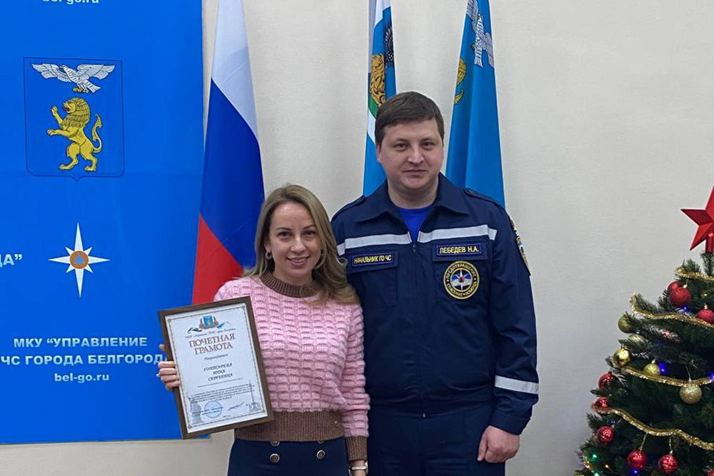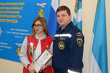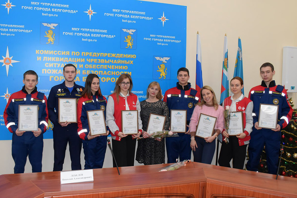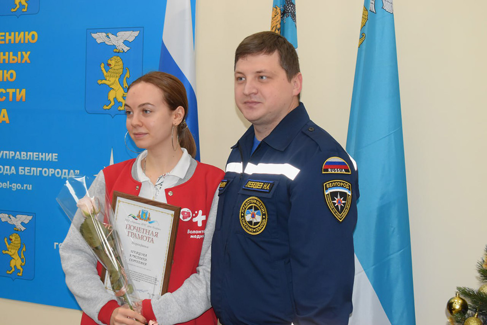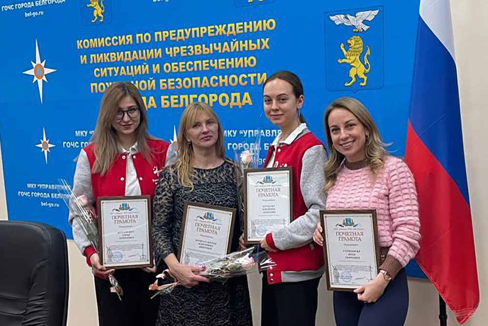 Почётными грамотами Управления ГОЧС города Белгорода за работу в пунктах временного размещения отмечены волонтёры-медики – студентки медицинского института НИУ «БелГУ» Дарья Фугаревич, Евгения Дронова, Кристина Шевцова и доцент кафедры детской стоматологии медицинского института Инна Гонтарева, а также заместитель директора Координационного центра по вопросам формирования у молодежи активной гражданской позиции, предупреждения межнациональных и межконфессиональных конфликтов, противодействия идеологии терроризма и профилактики экстремизма НИУ «БелГУ» Маргарита Варфоломеева. Награды волонтёрам вручил начальник Управления ГОЧС города Белгорода Николай Лебедев.