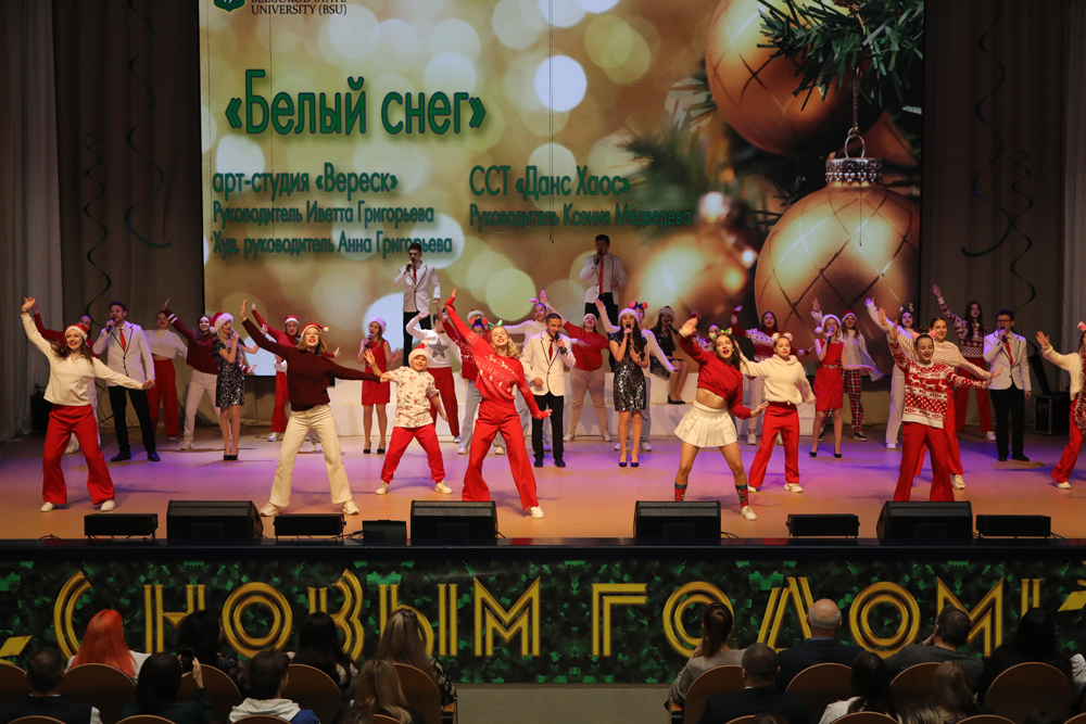 Сказочное праздничное настроение помогли создать не только любимые герои – Дед Мороз со Снегурочкой, но и творческие коллективы университета: «Школа ведущих», арт-студия «Вереск», студия современного танца «Данс Хаос», академический хор, группа «31-й регион», ансамбль народной песни «Отрада», ансамбль преподавателей «Гармония», коллектив «Ритм», студия «Мариданс», вокальные группы «Колорит», «Университет», ансамбль народного танца «Забава».