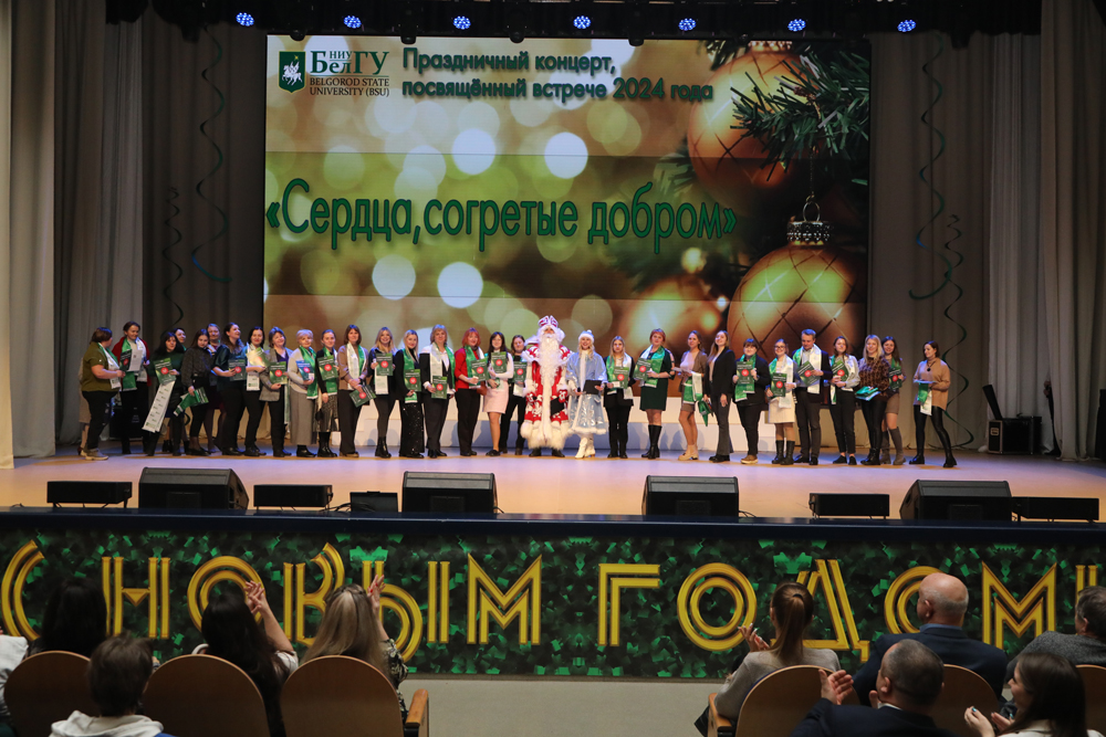 Ведущие праздничного мероприятия и Дед Мороз со Снегурочкой рассказали зрителям о мероприятиях, прошедших в рамках «Новогодней эстафеты добра» – о тематической выставке Музея истории НИУ «БелГУ» «Новогоднее путешествие», где было представлено более 1000 различных новогодних игрушек и фотографий из домашних коллекций сотрудников вуза; о межвузовском Чемпионате по командной интеллектуальной игре «Ирония судьбы, или Что? Где? Когда?»; о новогоднем утреннике для детей сотрудников университета «Время добрых чудес»; о традиционной рождественской благотворительной акции марафона «Тёплым словом – добрым делом», который охватил 565 детей и 43 одиноких пожилых человека.
