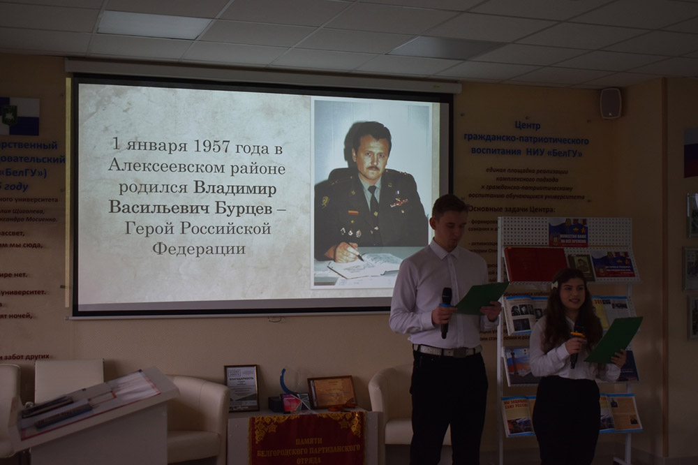 Участниками встречи стали студенты юридического института и историко-филологического факультета педагогического института НИУ «БелГУ». Вместе с главным гостем памятного вечера – вдовой героя Ириной Алексеевной Бурцевой – молодые люди узнали не только о подвиге героя, но и какие книги любил Владимир Васильевич, каким кинофильмам отдавал предпочтение и какие песни согревали ему душу.