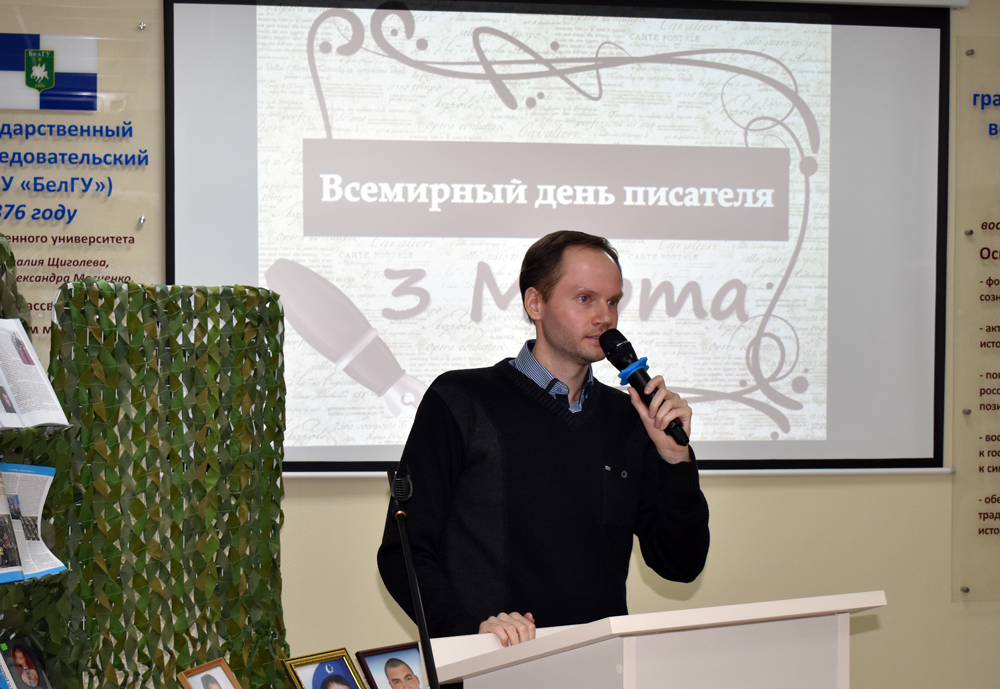 Встреча, в которой участвовали студенты институтов и колледжей НИУ «БелГУ», прошла в комбинированном формате. Специалист по библиотечно-выставочной работе научной библиотеки Ольга Анохина рассказала студентам об истории Всемирного дня писателя. Член Союза писателей России, полковник бронетанковых войск в отставке Николай Лутюк поделился со студентами историей своей жизни. Николай Александрович рассказал об участии в боевых действиях на территории Африки, в Афганистане. Так, во времена боевых действий в Эфиопии Николай Александрович подготовил танковый батальон для противостояния с силами Сомали. В литературу он пришёл в зрелом возрасте. Роман «Особый сплав» является главным его сочинением. Однажды, побывав в одной из школ Белгородской области, Николай Лутюк решил написать книгу очерков, чтобы увековечить память земляков, погибших в Афганистане. Увидев на одной из школ мемориальную доску, писатель решил, что о восемнадцатилетнем парне, погибшем, выполняя свой интернациональный долг, должны знать больше, чем могут сказать даты рождения и смерти. Полковник бронетанковых войск в отставке подарил университетской библиотеке свой четырёхтомник, изданный к юбилею.