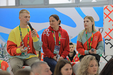 По видеосвязи председатель Союза студентов НИУ «БелГУ» Марина Усачёва поделилась впечатлениями об открытии Всемирного фестиваля молодёжи и мероприятиях, которые членам делегации Белгородской области удалось посетить в первые дни.