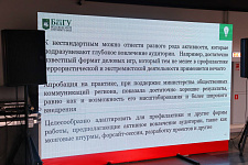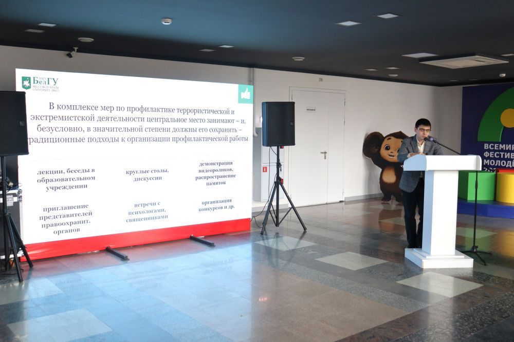 Оперуполномоченный ЦПЭ УМВД России по Белгородской области, майор полиции Эдуард Шелушинин отметил, что средние специальные и высшие учебные заведения находятся в первом эшелоне борьбы с деструктивными взглядами и образом мышления молодёжи и это представляет особую сложность и огромную ответственность за результат проводимой в данном направлении работы.