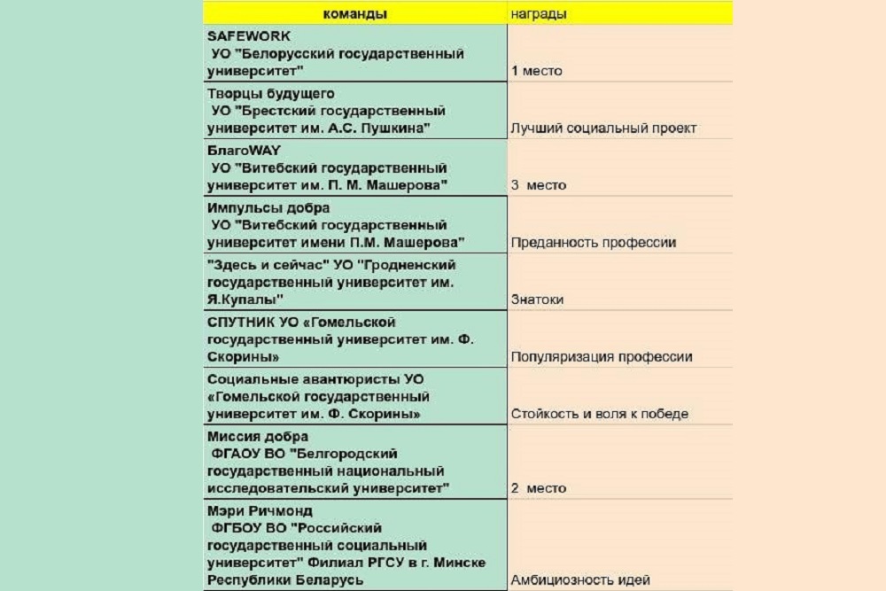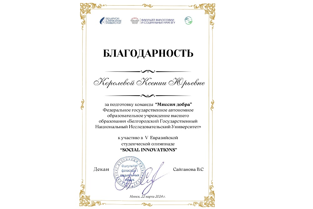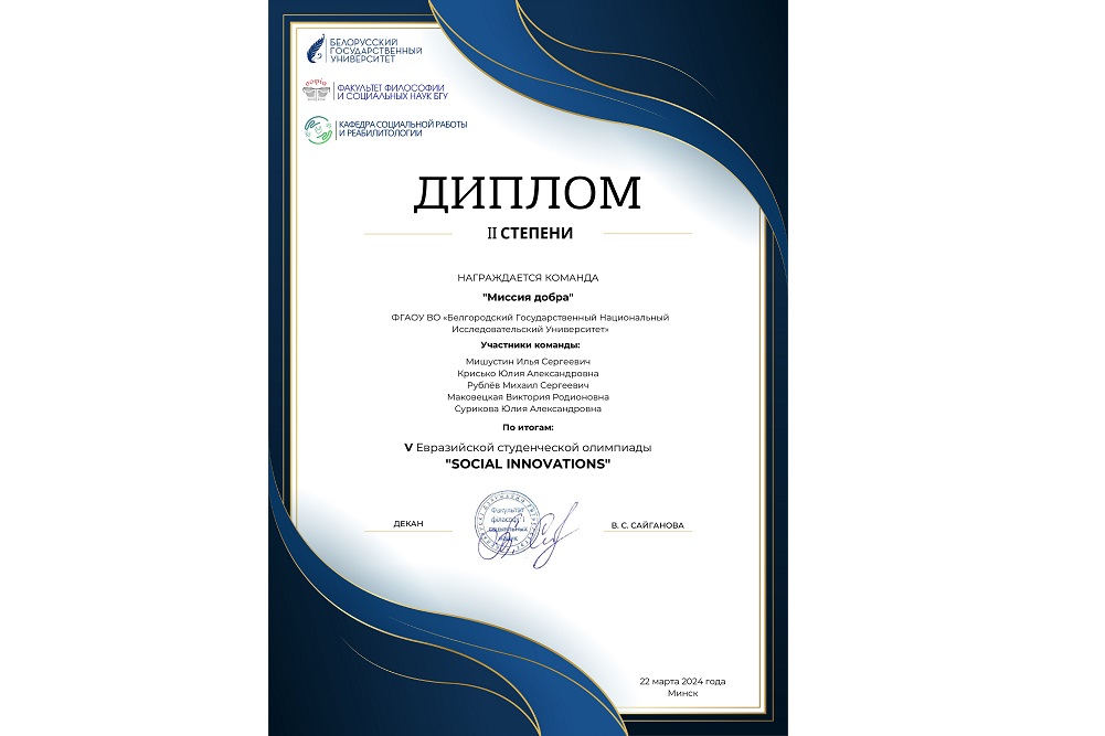 Участниками V Евразийской студенческой олимпиады Social innovations стали 9 вузов России и Беларуси. Белгородский госуниверситет представила команда «Миссия добра», в которую вошли студенты кафедры социальной работы института общественных наук и массовых коммуникаций НИУ «БелГУ»: Илья Мишустин, Юлия Сурикова, Анна Маркова, Михаил Рублёв и Юлия Крисько. Под руководством преподавателей кафедры социальной работы Ксении Королёвой и Ирины Волошиной команда смогла подготовиться и успешно представить Белгородский госуниверситет в международном профессиональном конкурсе для будущих специалистов по социальной работе.