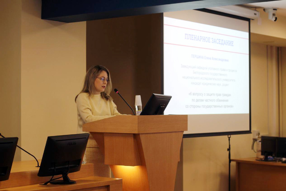 С пленарным докладом, который был посвящён защите прав граждан по делам частного обвинения со стороны государственных органов, выступила заведующая кафедрой уголовного права и процесса юридического института НИУ «БелГУ» Елена Першина.