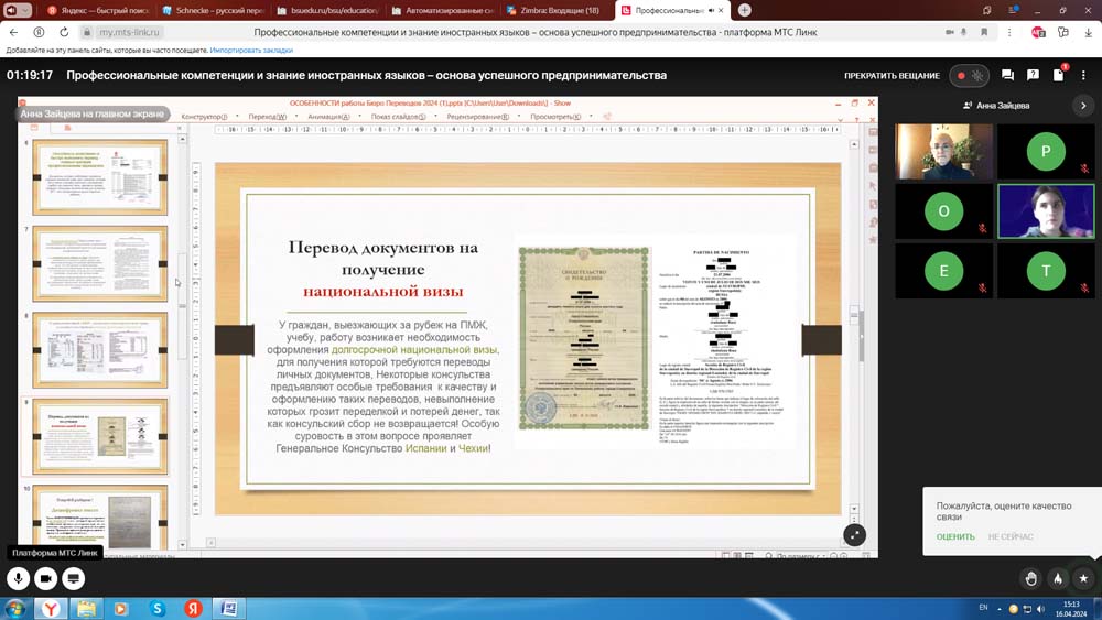 Сотрудник белгородского бюро переводов «Дружба народов» Анна Зайцева ознакомила участников форума с презентацией о специфике работы бюро, подготовленной совместно с директором фирмы Маргарита Найдёновой. Анна Юрьевна рассказала об особенностях деятельности малого предприятия, типах текстов и документов, перевод которых востребован у заказчиков, функциональных обязанностях менеджера бюро переводов, переводчика и редактора, а также трудностях, с которыми приходится сталкиваться переводчику. Особое внимание в докладе-презентации было уделено профессиональным качествам переводчика, ключевым из которых является способность корректно и быстро выполнить перевод.