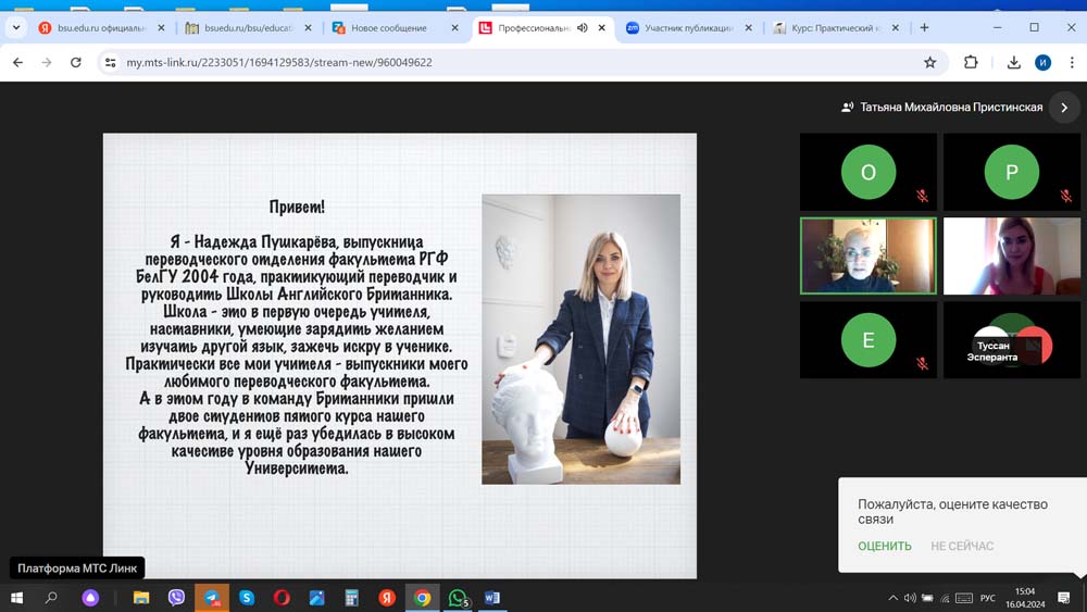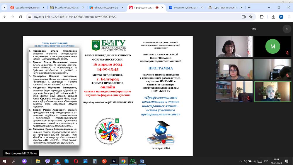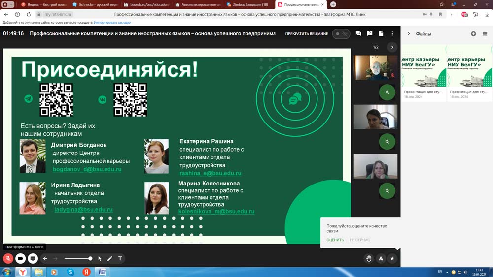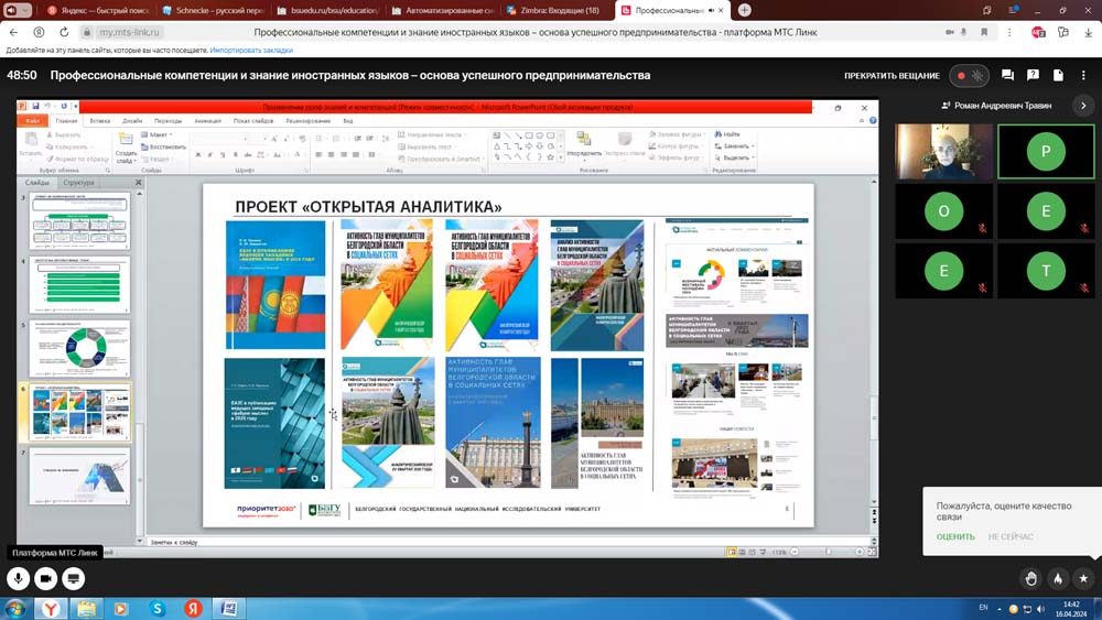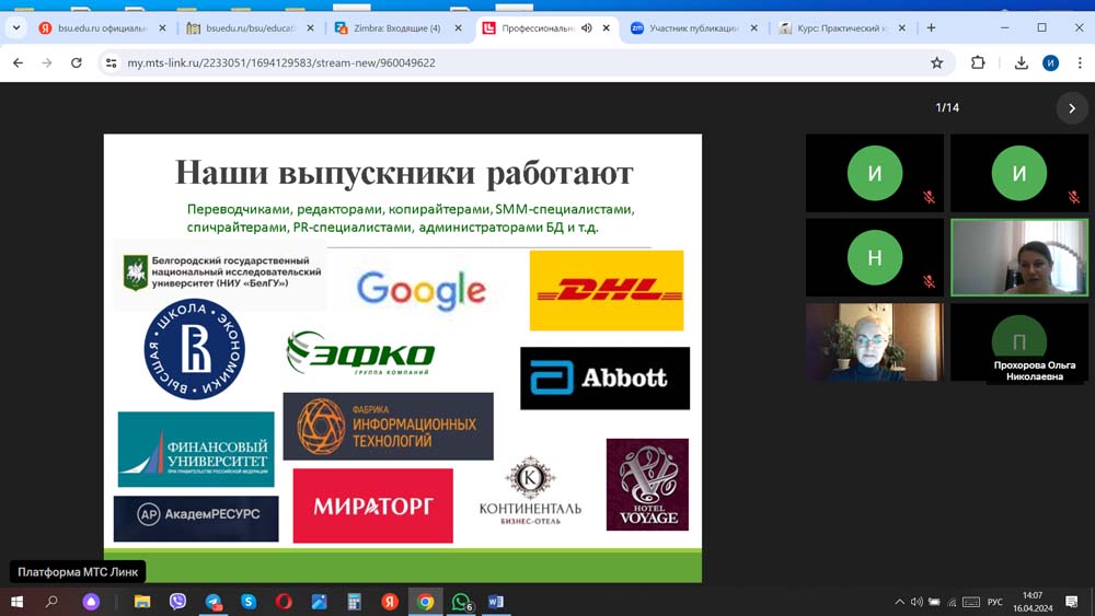 – Эти навыки, формируемые не только в процессе изучения иностранных языков, но и благодаря проектной деятельности обучающихся, их участию в стартапах, создают основу для успешной реализации инновационных идей, например, в СНО или «Клубе инноваторов» НИУ «БелГУ», – отметила Ольга Витальевна. В презентации она представила сферы деятельности выпускников ИМКиМО, а также компании и вузы, в которых они успешно трудятся.
