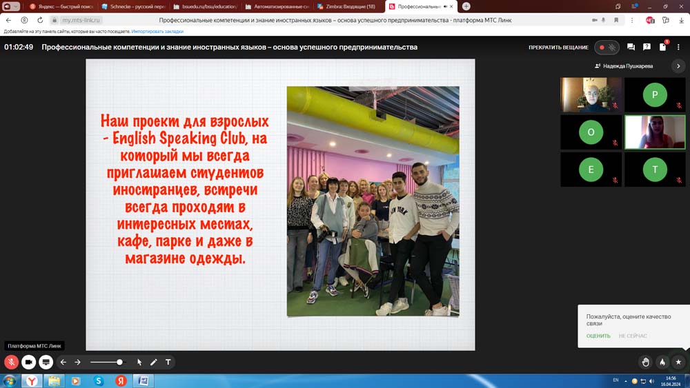 – Предпринимательская деятельность в сфере образования требует от специалистов нестандартных решений, умения быть гибкими, мобильными, искать инновации, работать в команде. В условиях западных санкций против России нашему коллективу, чтобы выстоять в условиях жёсткой конкуренции на рынке услуг, пришлось искать новые страны для образовательных поездок, например, ОАЭ, и продумывать новые формы работы с детьми и взрослыми, желающими изучать иностранные языки. Например, проект для взрослых English Spesking Club, – поделилась Надежда Пушкарёва.