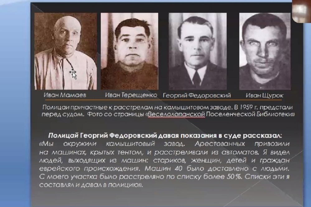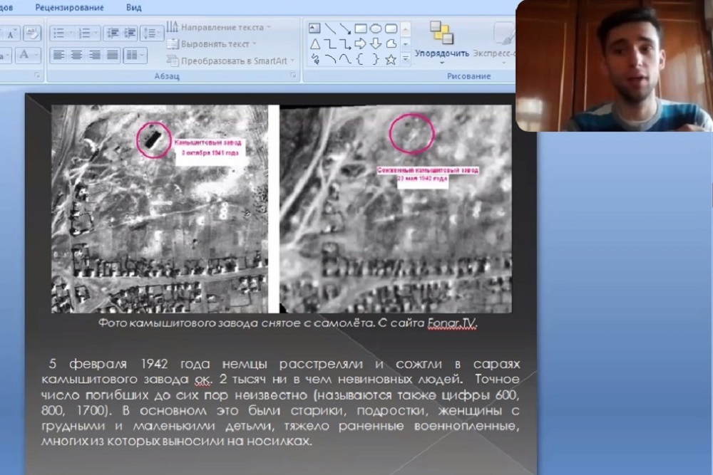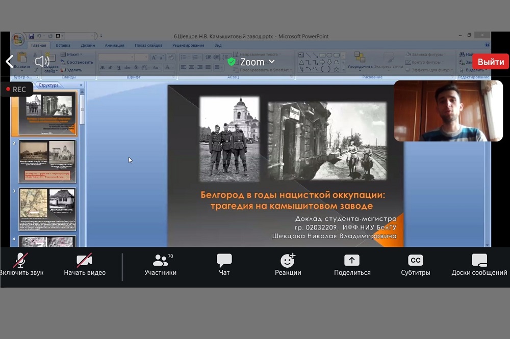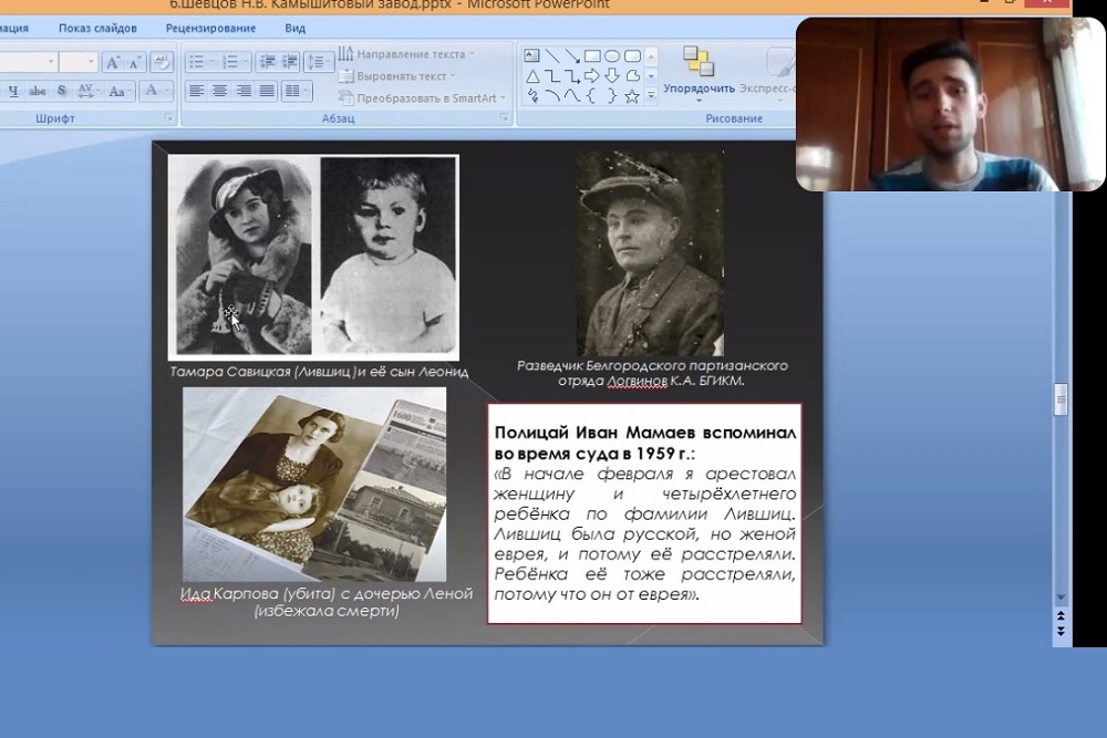 В комбинированном формате прошла встреча с мобильной бригадой студентов-историков, молодых учёных историко-филологического факультета педагогического института с представителями обучающихся всех институтов и колледжей, которые рассказали участникам памятного Дня о страшной трагедии, произошедшей на Камышитовом заводе, и зверствах по отношению к детям. Гостем мероприятия стала заместитель директора координационного центра ВПИТИПЭ Маргарита Варфоломеева, чьи научные интересы совпадают с тематикой проекта «Без срока давности» – преступления нацистов и их пособников в отношении мирных жителей и военнопленных на оккупированной Белгородчине. Маргарита Ивановна на конкретных примерах описала злодеяния, которые творили фашисты в Белгороде, и призвала никогда не забывать о геноциде советского народа во время Великой Отечественной войны.