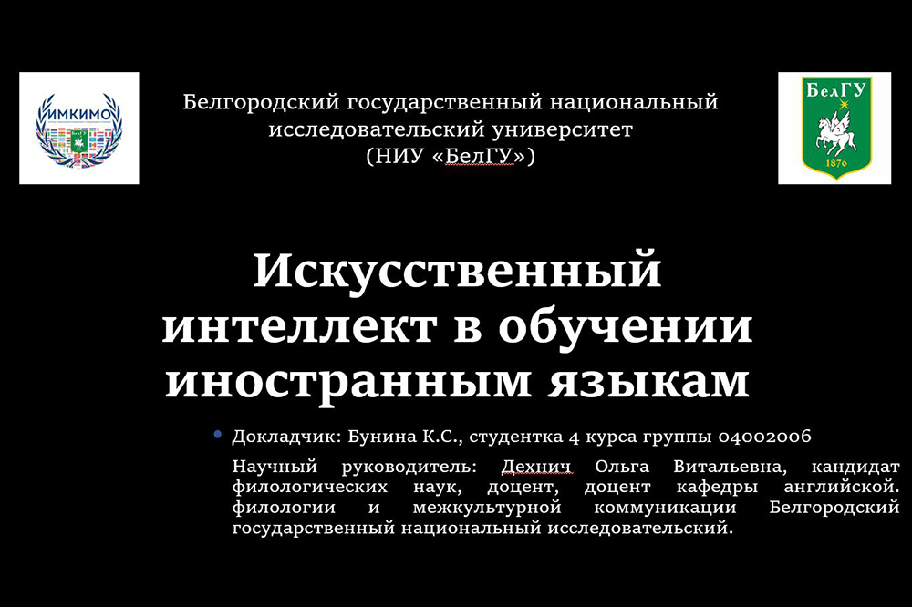 Белгородский госуниверситет на научном форуме представила студентка института межкультурной коммуникации и международных отношений специальности «Перевод и переводоведение» Ксения Бунина. Она представила в секции «Искусственный интеллект и цифровые технологии в образовании» доклад на тему «Искусственный интеллект в обучении иностранным языкам». Ксения рассказала о сервисах и платформах на основе ИИ, которые можно использовать для изучения иностранных языков, в частности английского и китайского.