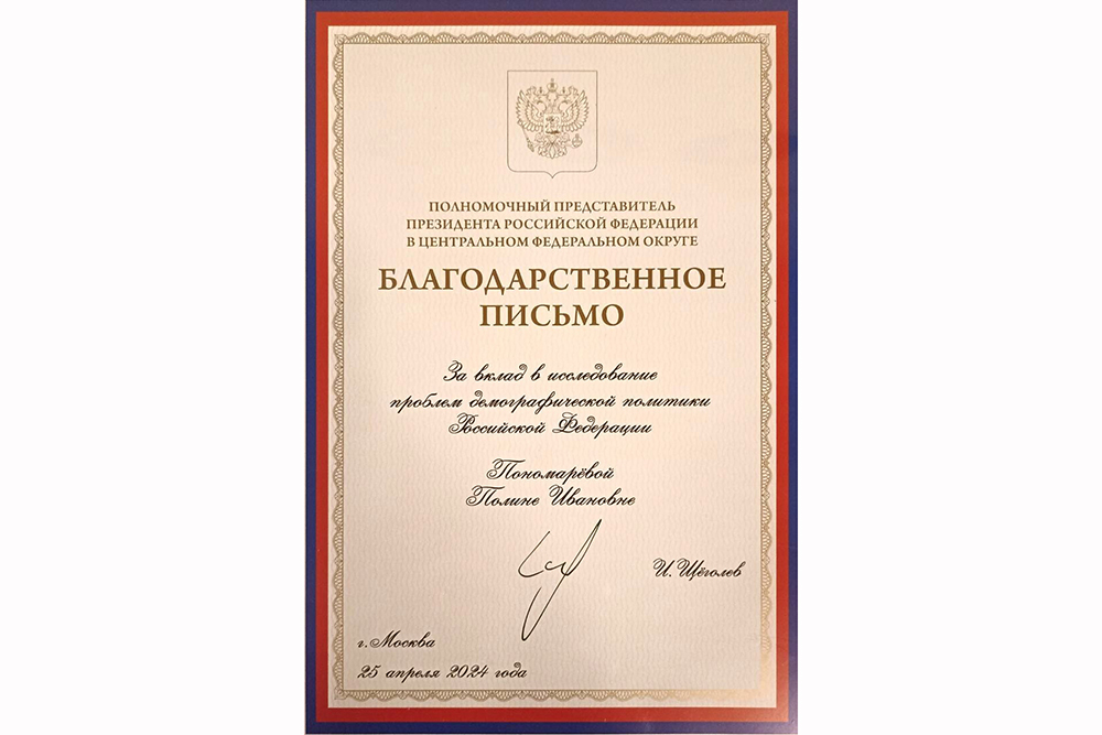 Студентка 4 курса бакалавриата направления подготовки «Социальная работа» НИУ «БелГУ» Полина Пономарёва стала победителем II Всероссийского конкурса научно-исследовательских работ молодых учёных «Менделеевские чтения» с работой «Коррекция детско-родительских отношений в многодетной семье». На пленарном заседании второй Ежегодной Всероссийской конференции «Россия – большая семья больших семей. Многодетность как новая норма» победитель получила награду и благодарственное письмо от полномочного представителя Президента России в ЦФО Игоря Щёголева.