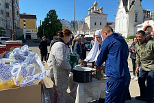Также волонтёры организовали праздничный обед для подопечных сестричества милосердия: бездомных, малоимущих людей, вынужденных переселенцев. Студенты-добровольцы раздали нуждающимся главные символы Пасхи – крашенные яйца и куличи – и порадовали людей полноценными продуктовыми наборами.