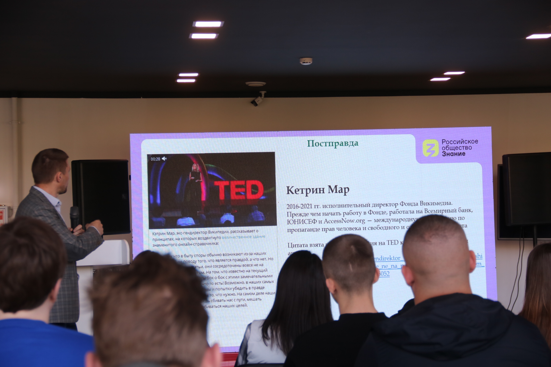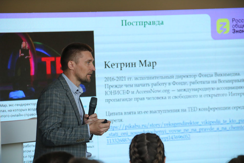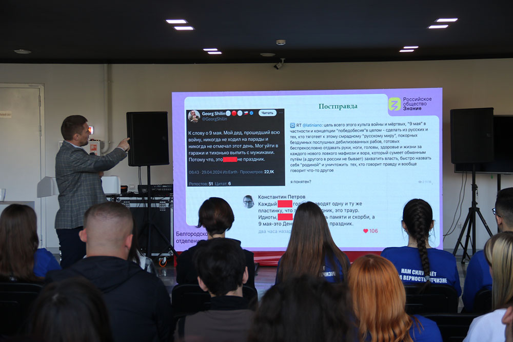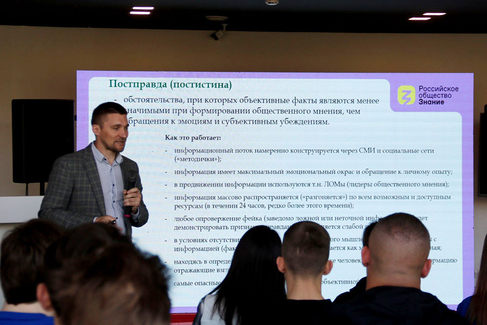 Как отметил лектор, искажение истории о войне намеренно конструируется через СМИ и социальные сети, информация имеет максимальный эмоциональный окрас, в её продвижении используются лидеры общественного мнения, блогеры. Умело создаваемая фиктивная правда об исторических событиях тех лет массово распространяется по всем возможным и доступным ресурсам и воспринимается как максимально объективная.