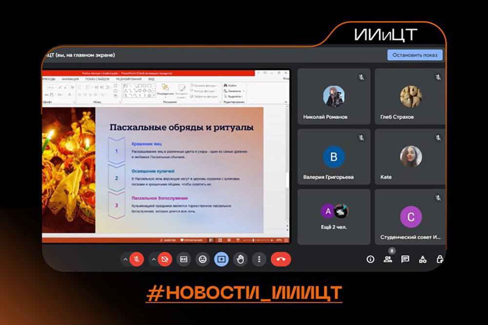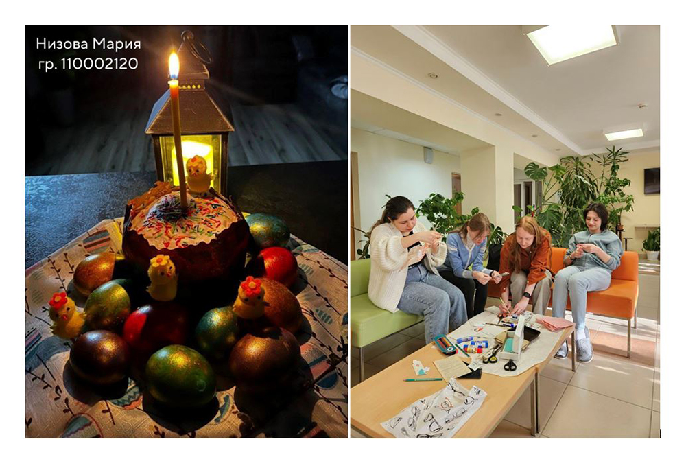 В институтах и колледжах вуза прошли тематические классные и кураторские часы, круглые столы, направленные на формирование духовно-нравственных и этических норм поведения, квизы, онлайн-фотовыставки и фотоэкспозиции, а также мастер-классы по изготовлению пасхальных сувениров и кулинарное путешествие «Пасхальный кулич: рецепты сквозь времена».