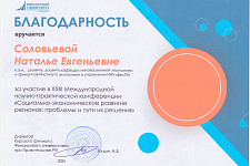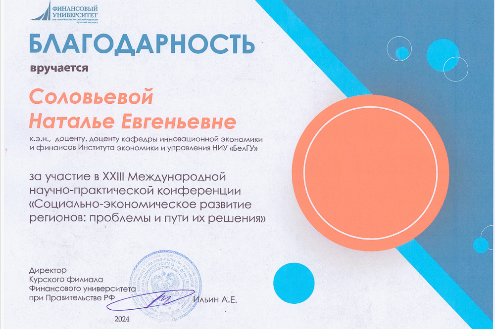 Участие в научно-практической конференции на базе курского филиала Финансового университета при Правительстве РФ приняла доцент кафедры инновационной экономики и финансов института экономики и управления НИУ «БелГУ» Наталья Соловьёва. Особое внимание учёные уделили проблемам социально-экономического развития регионов, связанным с неравномерным распределением ресурсов, неэффективным использованием потенциала и недостаточно развитой инфраструктурой. Вместе с тем были приведены примеры успешных практик и обозначены возможные пути решения идентичных для ряда регионов проблем как с участием федерального центра, так и на местном уровне.