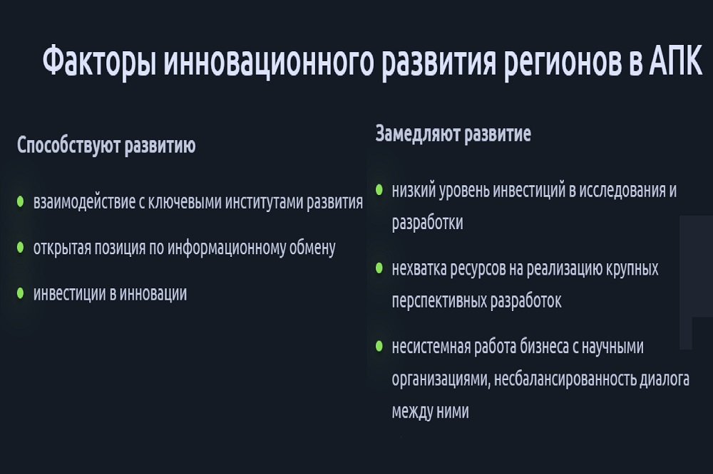 В качестве факторов, отрицательно влияющих на развитие инноваций в АПК регионов, спикер обозначила низкий уровень инвестиций в исследования и разработки, нехватку ресурсов на реализацию крупных перспективных разработок, а также несистемную работу бизнеса с научными организациями и несбалансированность диалога между ними. К положительным факторам, по мнению учёного, можно отнести взаимодействие с ключевыми институтами развития, открытую позицию по информационному обмену и инвестиции в инновации, в том числе и в агротех-стартапы.