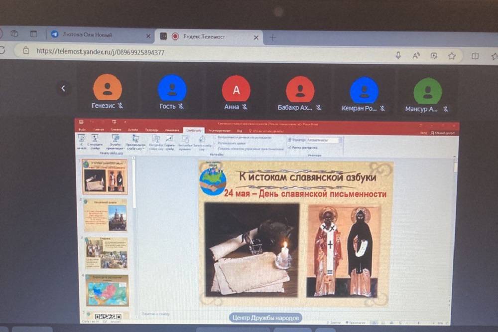Модератор мероприятия руководитель Центра дружбы народов Ольга Лютова, сама являясь учителем русского языка и литературы, очень живописно представила рассказ об истоках славянской письменности и развития славянской культуры в целом, заложенными Кириллом и Мефодием.