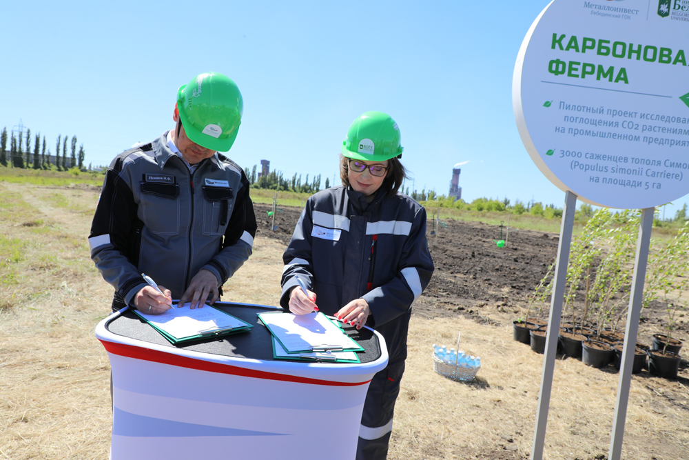 Ректор НИУ «БелГУ» Евгения Карловская и управляющий директор Лебединского горно-обогатительного комбината Металлоинвеста Ильдар Искаков подписали три соглашения и высадили 16 саженцев тополей в знак начала сотрудничества по углеродной тематике.