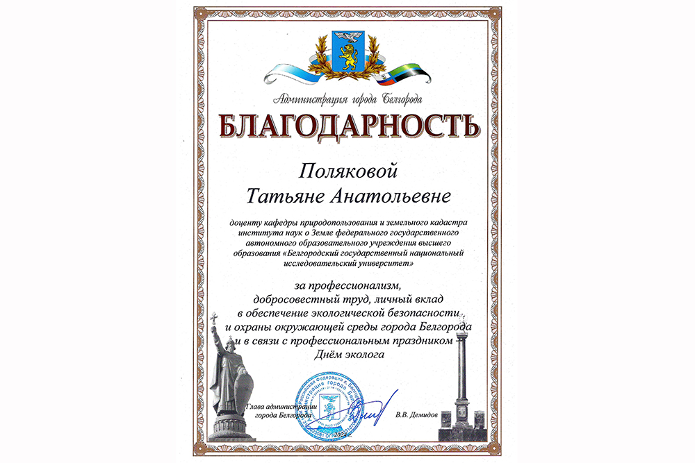 Указом Президента РФ в нашей стране 5 июня объявлен Днём эколога. Наряду с коллективом вуза Благодарностью администрации города Белгорода за профессионализм, добросовестный труд, личный вклад в обеспечение экологической безопасности и охраны окружающей среды города Белгорода поощрена и.о. завкафедрой природопользования и земельного кадастра института наук о Земле Татьяна Полякова. Награды Татьяне Анатольевне и директору института наук о Земле Игнату Игнатенко вручила заместитель главы администрации города – главный ландшафтный архитектор Елена Семенкова.