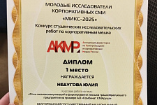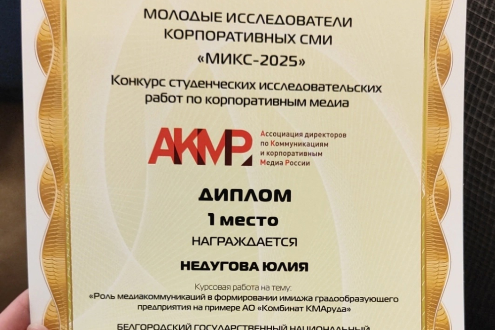 В номинации «Лучшая курсовая работа» победителем стала студентка института общественных наук и массовых коммуникаций НИУ «БелГУ» Юлия Недугова. На конкурс она представила научное исследование «Роль медиакоммуникаций в формировании имиджа градообразующего предприятия (на примере АО «Комбинат КМАруда»)».